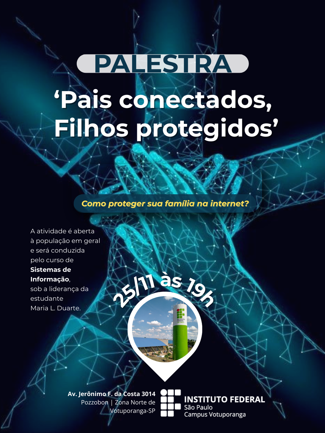 A Direção Geral do Campus Votuporanga do Instituto Federal de São Paulo (IFSP) convida mães, pais e responsáveis legais por crianças e adolescentes em idade escolar a prestigiar a palestra “Pais conectados, filhos protegidos”, que acontece na próxima terça-feira, 25 de novembro de 2025, às 19h, no Auditório do campus.