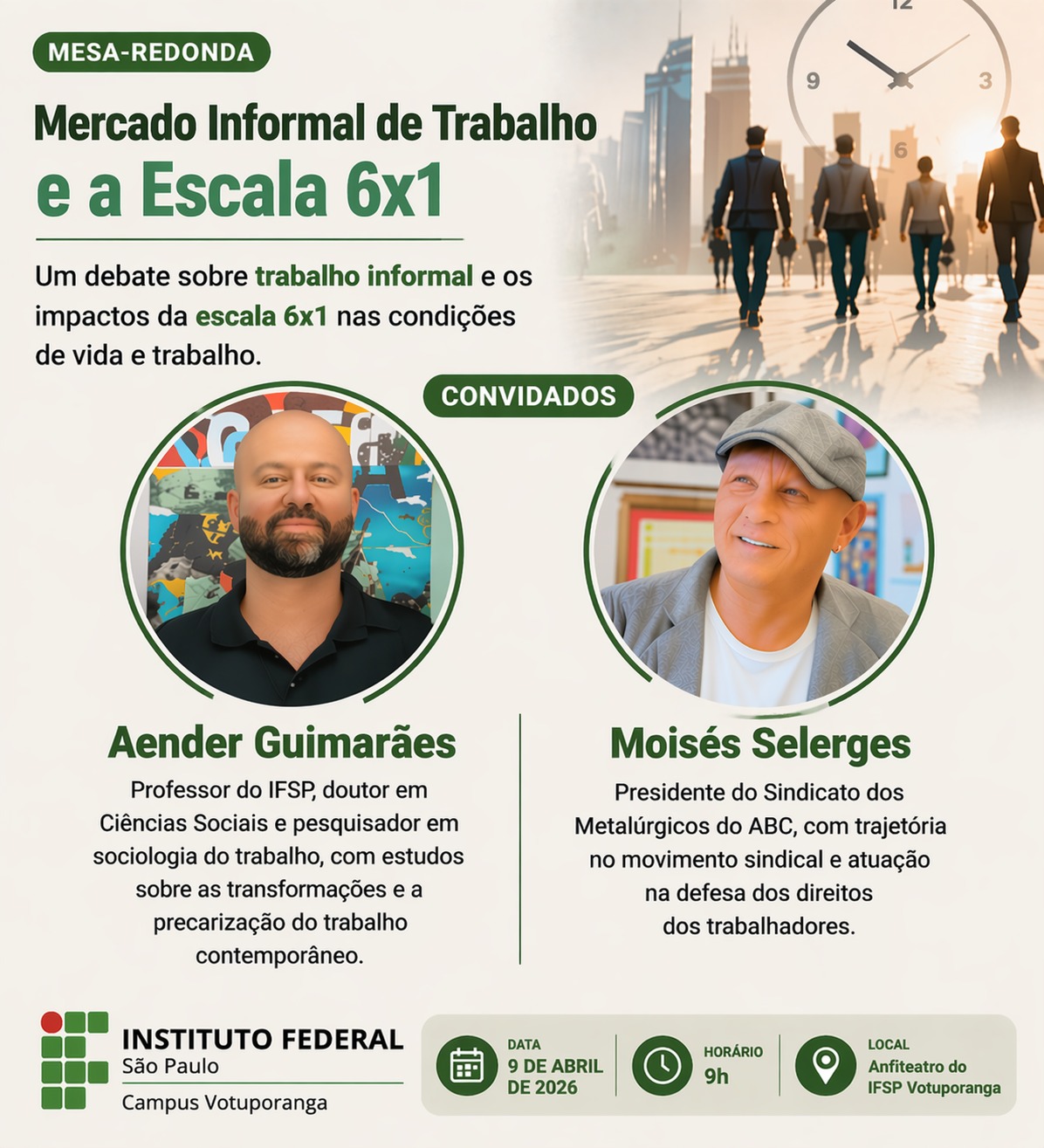 A Direção-Geral do IFSP Campus Votuporanga convida a comunidade em geral — estudantes, servidores e público externo — para a mesa-redonda “Mercado Informal de Trabalho e Escala 6x1”, a ser realizada no anfiteatro do campus no dia 9 de abril de 2026, às 9h.